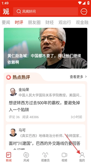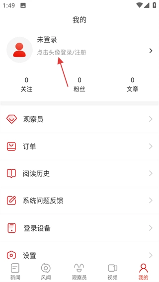 1、打开观察者网,点击页面右下角我的,可进入个人中心页面。