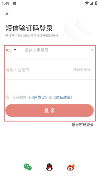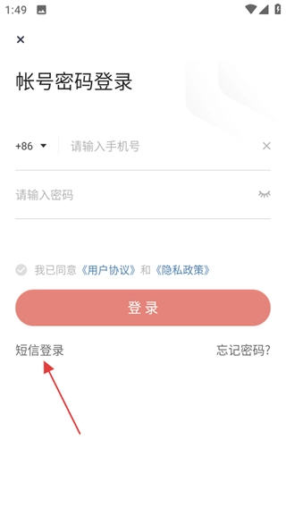 3、在登录页面,点击短信登录可进入短信验证码登录页面。