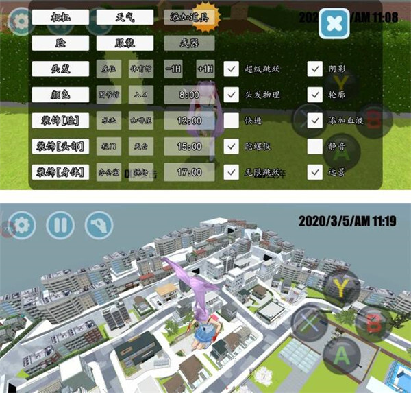 左上角的设置功能十分丰富,能实现传送至多个地点、随时更换服饰与发型、调整天气、获取武器、改变时间以及设置阴影等多种操作。