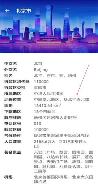 4、查看完毕后,可进一步查看北京市的详细信息,包括面积、人口等内容,从而完成城市信息的查询。
