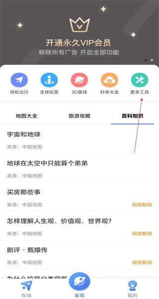打开软件后,进入发现页面,在那里能看到百科知识等分类,接着选择更多工具选项,就可以进入实用工具页面了。