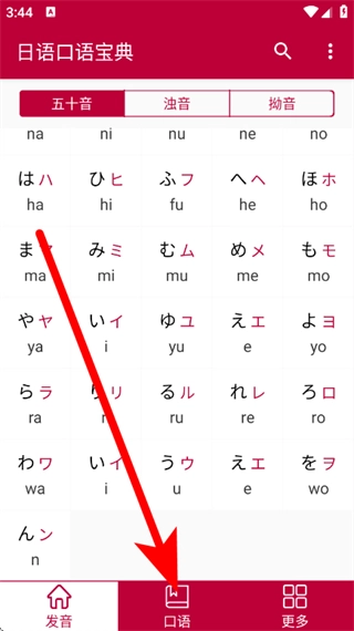 1、在日语口语宝典首页,点击底部口语按钮,进入口语分类页面。