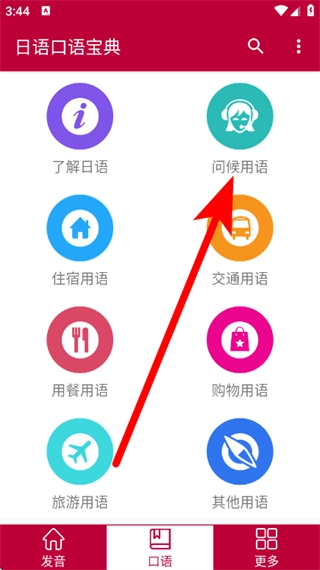 2、在口语分类页面,点击选择问候用语,进入问候用语的子分类页面。