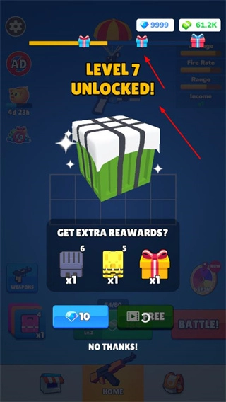 2、解锁新关卡后,可获取额外奖励,积累资源用于枪械合成与升级。