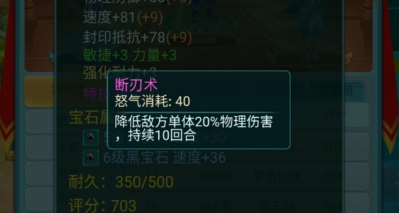 <断刃术>:"降低敌方单体20%物理伤害,持续10回合"。消耗怒气值:40