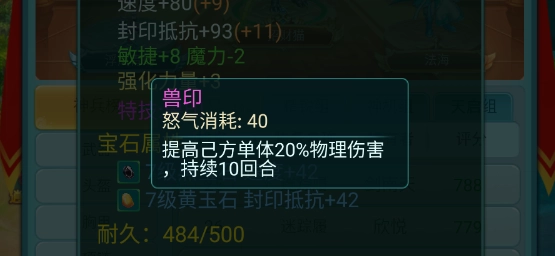 <兽印>:"提高己方单体20%物理伤害,持续10回合"。消耗怒气值:40