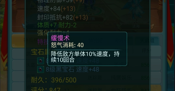 <缓慢术>:"降低敌方单体10%速度,持续10回合"。消耗怒气值:40