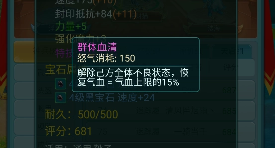 <群体血清>:"解除己方全体不良状态,恢复气血 = 气血上限的15%"。消耗怒气值:150