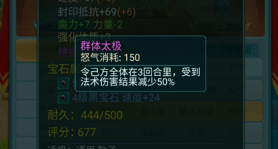 <群体太极>:"令己方全体在3回合里,受到法术伤害结果减少50%"。消耗怒气值:150
