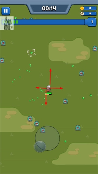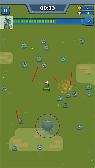 1、操控角色在地图中移动,收集绿色晶体资源,同时攻击蓝色怪物,提升等级。