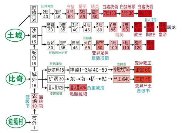7.刷完尸王之后可以去刷沃玛教主(位置在神殿大厅55坐标处),也可以选择其他掉落特戒的boss,具体刷哪个可以根据地图提示来决定。理论上来说,在角色满级之前不需要去挑战高难度副本里的boss,因为其他装备作为过渡已经足够使用了,而且在刷这些boss的过程中说不定还能掉落不错的极品装备。