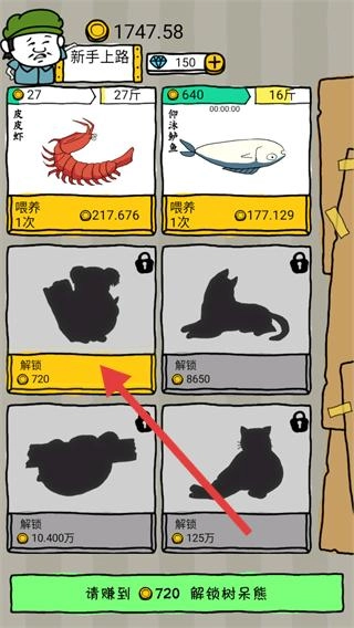 2、当积累到足够资源,可以解锁时,点击动物下方的解锁按钮。