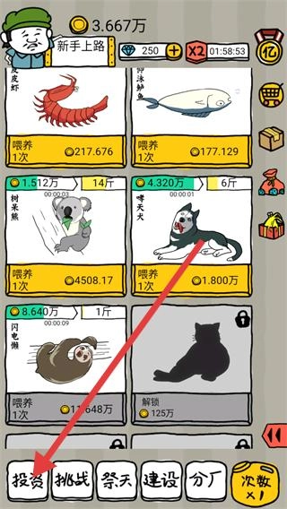 4、选择需要的动物进行投资,投资后可获得加倍收益,加快资源积累。