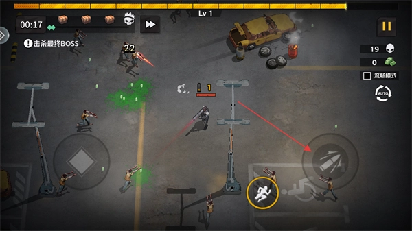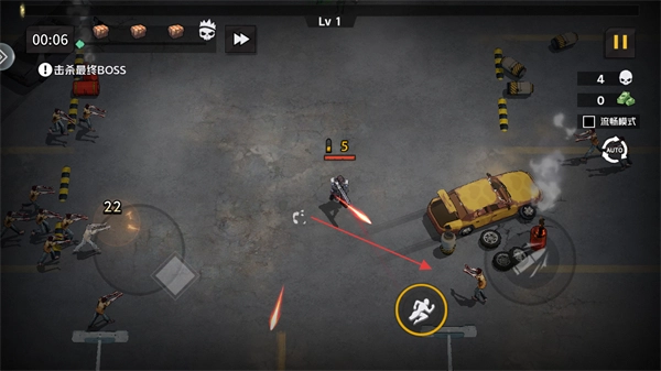 1、进入游戏后,先确认自己当前等级为Lv1,以及本关卡的目标是击败最终BOSS;接下来,你可以通过屏幕左下方的虚拟摇杆来控制角色的移动和走位。