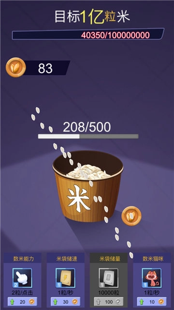 1.这款游戏的核心玩法是数米粒,游戏开始时目标就清晰地显示在屏幕正上方——需要数满1亿粒米。不过在数米的过程中,随着米粒数量的累积,系统会解锁一些小道具来辅助玩家。