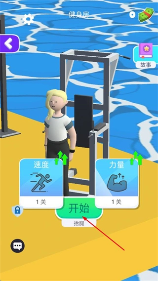 1、找到健身器材,点击开始按钮,可进行如抬腿等健身动作,完成后提升角色能力。