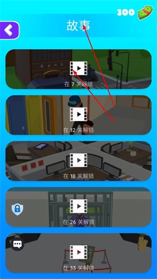 3、点击故事按钮,可查看不同关卡解锁的故事视频,达到对应关卡后可观看故事内容。