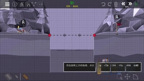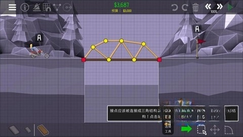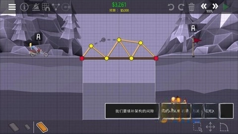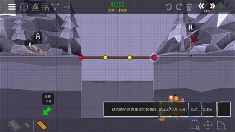 接下来进入第二关(1.2),玩家要借助给出的四个锚点搭建一座既稳固又能承载卡车重量的桥梁,三角形结构可是关键所在哦。