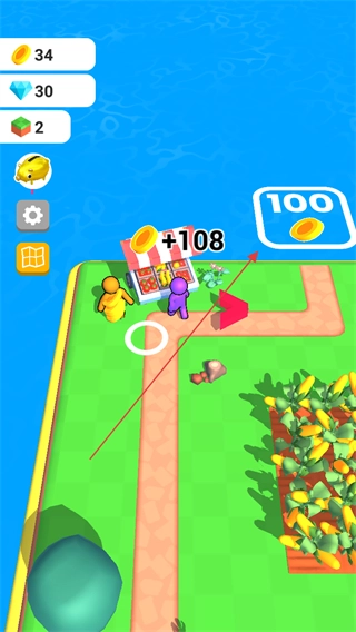 4、在商店处售卖作物,获取金币奖励如+108金币,积累资源以扩大农场规模。