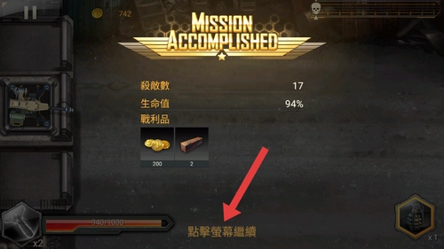 4、战斗结束出现MISSIONACCOMPLISHED界面后,查看杀敌数、生命值及战利品情况,点击屏幕继续进入下一环节。