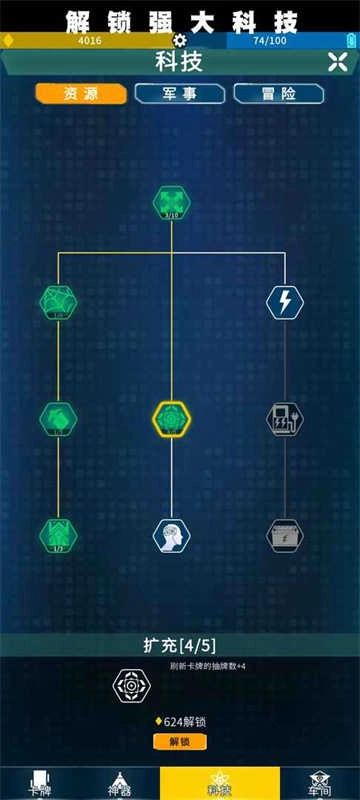 获取氪金和能量等资源,部分特殊资源卡能够进行抓牌和弃牌等操作。