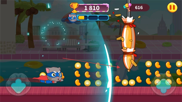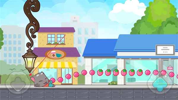 1、操控汤姆猫在城市街道中奔跑,收集沿途的草莓、糖果等道具,积累得分。
