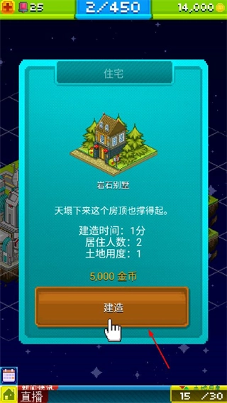 1、在建筑界面,选择岩石别墅等住宅,消耗金币点击建造,开启建筑施工,为城镇增加居住人口。