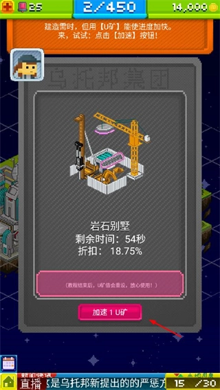 2、建筑施工时,点击加速1U币,减少剩余建造时间,同时享受折扣,提升建造效率。