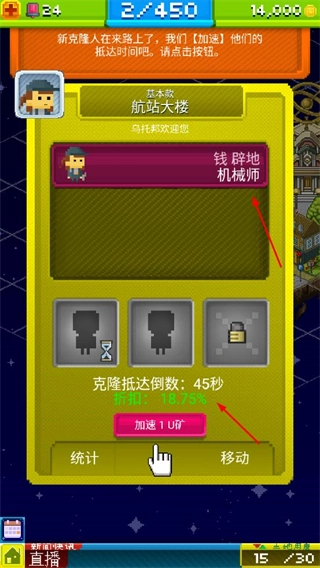 3、在居民招募界面,加速克隆抵达进程,获取钱醉地机械师等居民,为城镇发展提供人力支持。