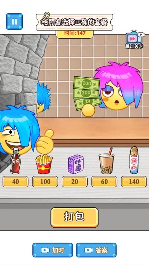在这款游戏里,你将化身某家餐吧的“金牌点餐员”。前来光顾的顾客们都有着各式各样的用餐需求,例如有的顾客会点三份完全相同、且包含饼与饮料的套餐,还有的顾客会明确指定要含有薯条的下午茶套餐。你需要在规定的时间内,依据顾客提出的具体要求,从可乐、薯条、葡萄汁、奶茶、饼干等众多食物和饮品里,挑选出符合要求的搭配组合,进而完成打包工作。