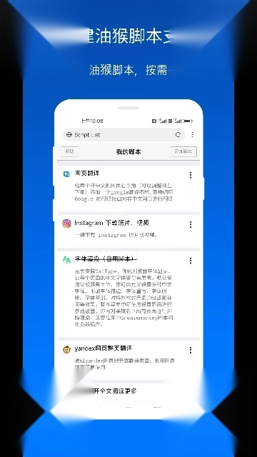 2、内建支持油猴脚本,无需安装第三方脚本管理器,兼容大部分油猴脚本。