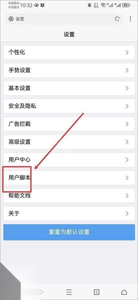 3、进入后设置界面后,点击用户脚本