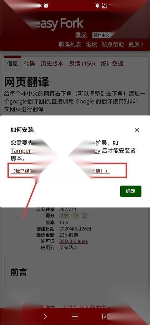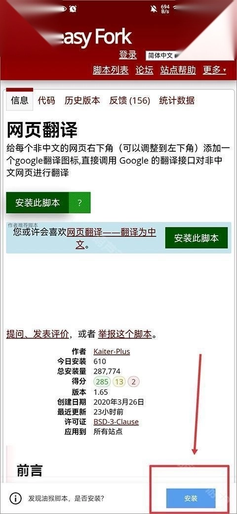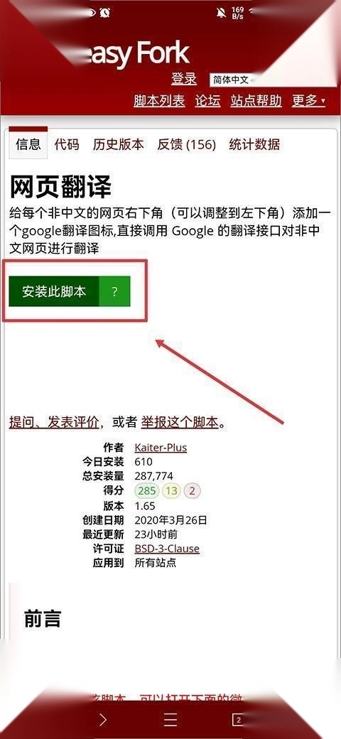 1、我们以网页翻译这个脚本为例,打开脚本详情页,直接点击””安装此脚本””按钮。