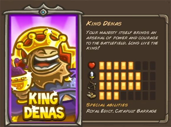 国王亲自上阵,架势确实威风,可在战场上倒成了个“喜剧担当”。我一开始以为他是乘战车来的,凑近一看才发现是俩侍从抬着走的——他实在太胖,抬轿的人又偏瘦弱,移动速度慢得不行。虽说他是远程攻击,但攻击范围小得可怜;能给防御塔加攻击,可到了后期这点增益基本没啥用。流星雨技能看着挺唬人,实际伤害也就一般般。按说这么胖的体格该很抗揍吧?结果是个脆皮,没几下就被放倒了。