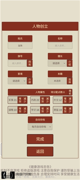 1、进入游戏后,先把属性点集中加在“学识”上,保证开局时学识达到30点就行,第一代角色不用在学业上耗费时间,毕竟学业成果对当前这一代角色没什么明显的收益,关键是要尽快满足条件进入仕途。