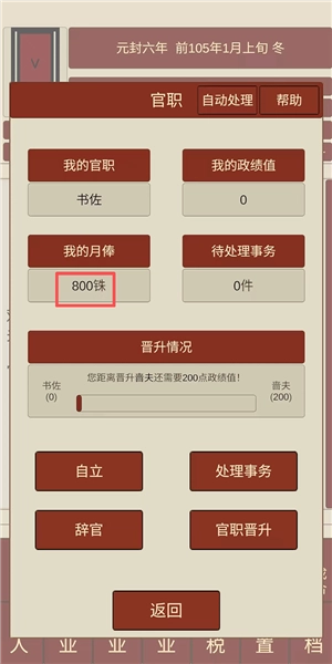 2、当学识达到30点后,即可成功入仕,起薪月俸800,这份收入足以支撑家庭生活,无需再费时经营农田或副业。