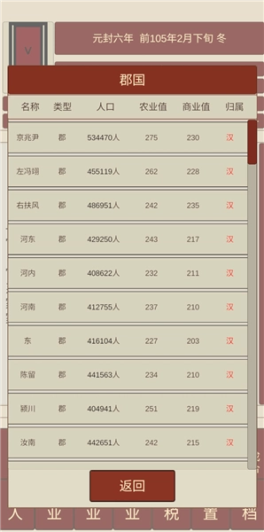 您也可以为地方制定发展策略,选择发展农业、商业,或是强化军心、民心。结合太守的对应能力数值,能够实现地方的长治久安。一旦地方出现叛乱,太守可能会遭遇不测,也有机会幸免于难。
