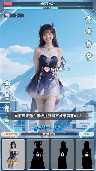 2、当前魅力等级提升后,可使所有女神的好感度获取效率提升至 1.1 倍,加速攻略进程。