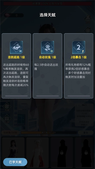 5、成功攻略当前单名女神后,就能解锁下一位女神的攻略环节;游戏前期通过点击屏幕可快速升级,解锁异能天赋后系统会自动获取礼物,这样就能实现离线挂机功能了。