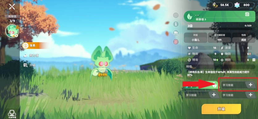 2、点击右下角空白处学习技能。