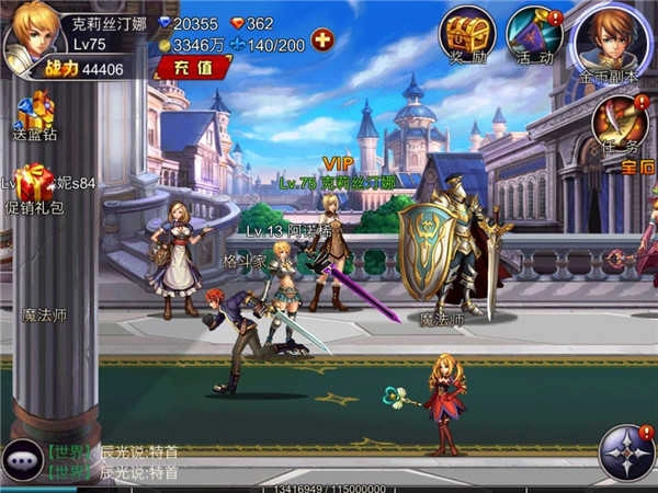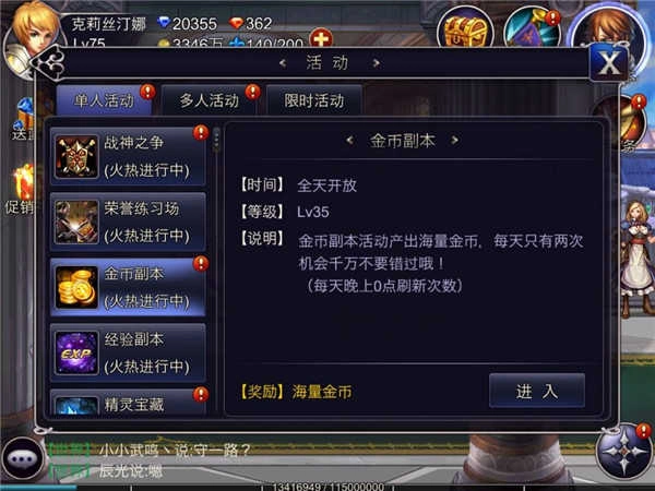 3、任务栏:处于屏幕右上角的位置,涵盖奖励、活动、副本、任务这四大功能模块。其中奖励的二级菜单里有英雄奖励、签到奖励、成长奖励、排名奖励、充值奖励以及补偿奖励;活动部分包含单人活动、多人活动和限时活动;任务板块则有已接任务、每日任务等内容。
