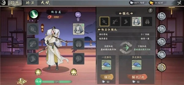 6、装备强化等级上限为99级,强化仅需消耗星尘与白银,同时对境界有要求,最低需达到锻骨一重。