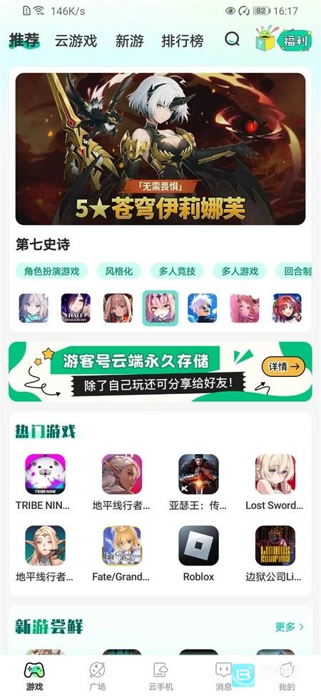2、进入首页,在首页浏览自己喜欢的云游戏。
