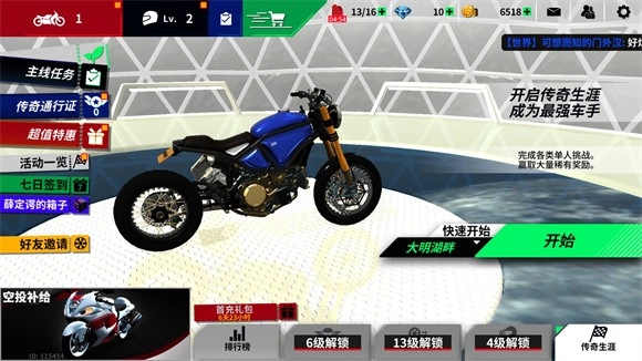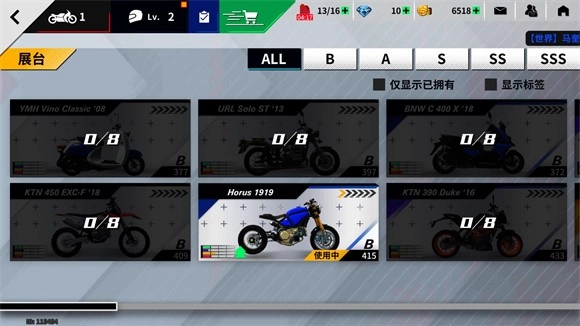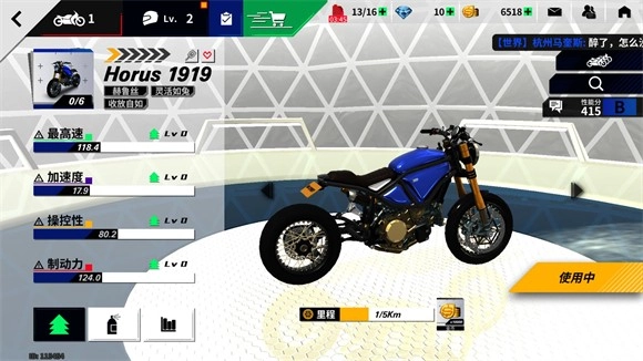 5、在主界面点击左上角可以进入车库查看拥有的摩托。
