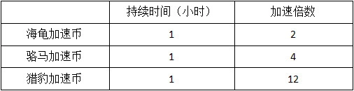 玩家进入商店后,在生产界面的右侧能找到加速选项。点击加速币选项,就能看到三种加速币,分别是海龟加速币、骆马加速币和猎豹加速币。