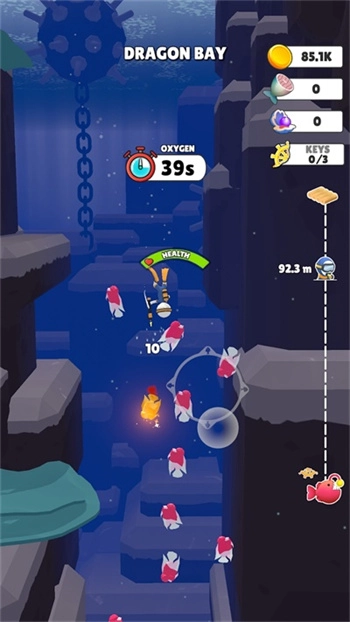 2. 捕捉鱼类与宝藏:玩家进入可攻击范围后,可对鱼类发起攻击,以此捕捉各类鱼类和宝藏。返回展台后,可将这些捕获物出售以换取货币,所得货币可用于购买潜水相关的道具与装备。