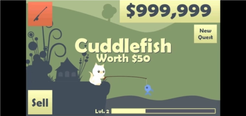 2、钓到鱼之后,长按手机屏幕就能把鱼钓上来,点击左下角的【sell】按钮卖掉鱼,就能得到金币。