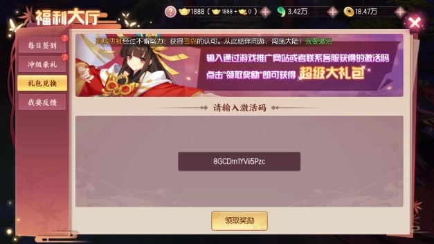 2、在福利大厅我们就能看到礼包兑换的菜单了,如下图小编所示位置