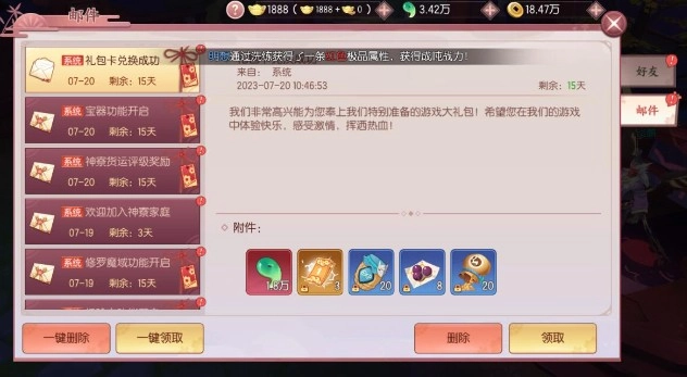 5、进入到邮件后就会看到礼包卡兑换成功的内容了,我们点击领取就可以获得灵玉、坐骑口粮等奖励了