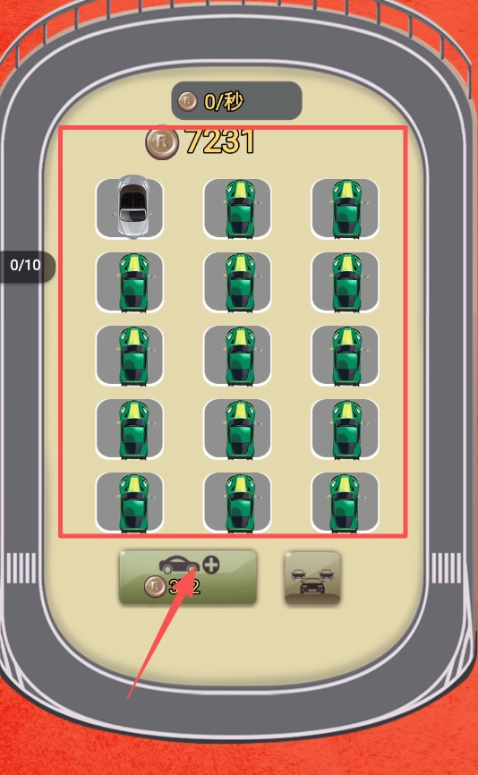 3、看俯视停车场,点底部绿色小车加号按钮,可能花费32金币购买车辆,扩充停车数量。